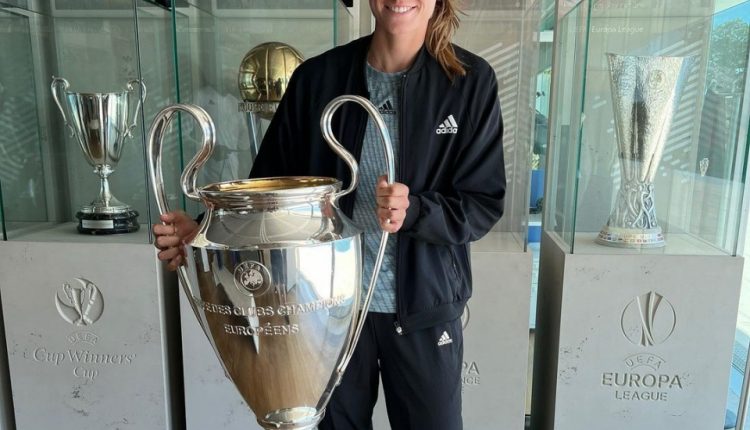 Победительница Уимблдона Елена Рыбакина побывала в трофи-руме UEFA и сфотографировалась там с трофеем главного клубного турнира Европы – Кубком Лиги чемпионов